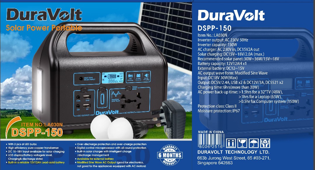 Robust Inverter Capacity: Boasting a capacity of 150W, the Duravolt inverter effectively transforms solar energy into usable power for a variety of applications. With its maximum output, you can confidently power small appliances, lights, power your Laptop and other electronic devices with uninterruptable power supply .